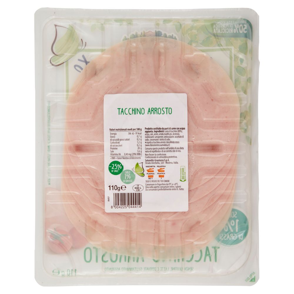 Carne di tacchino (80%), acqua, sale, aromi, amido modificato, destrosio, stabilizzanti: carragenine, antiossidante: ascorbato di sodio, conservante: nitrito di sodio.