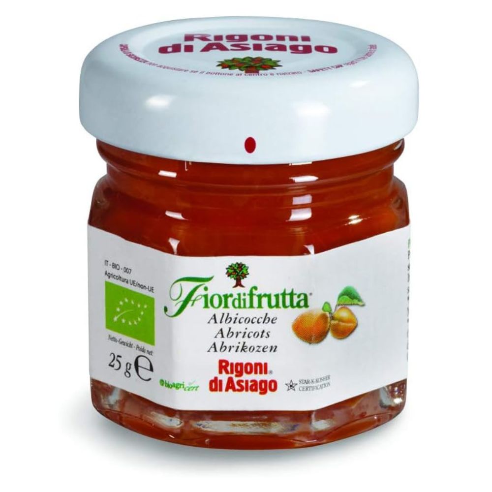 Confettura BIO di frutta Extra all'albicocca della Rigoni di Asiago senza glutine, conservata in pratico vasetto monodose in vetro da 25 gr.