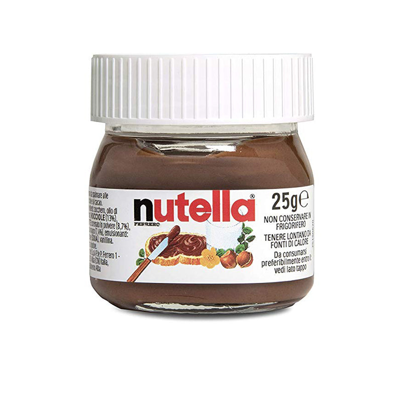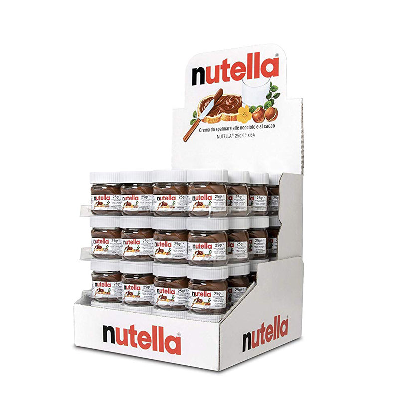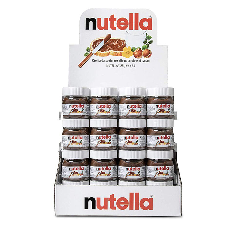 64 vasetti da 25 grammi ciascuno dell’unica e inconfondibile Nutella, la crema da spalmare alle nocciole e al cacao più famosa del mondo. \nI mini vasetti di Nutella sono un simpatico regalo per una festa oppure possono essere riutilizzati come portaspezie o segnaposti. Scatena la tua fantasia con i mini vasetti di Nutella!